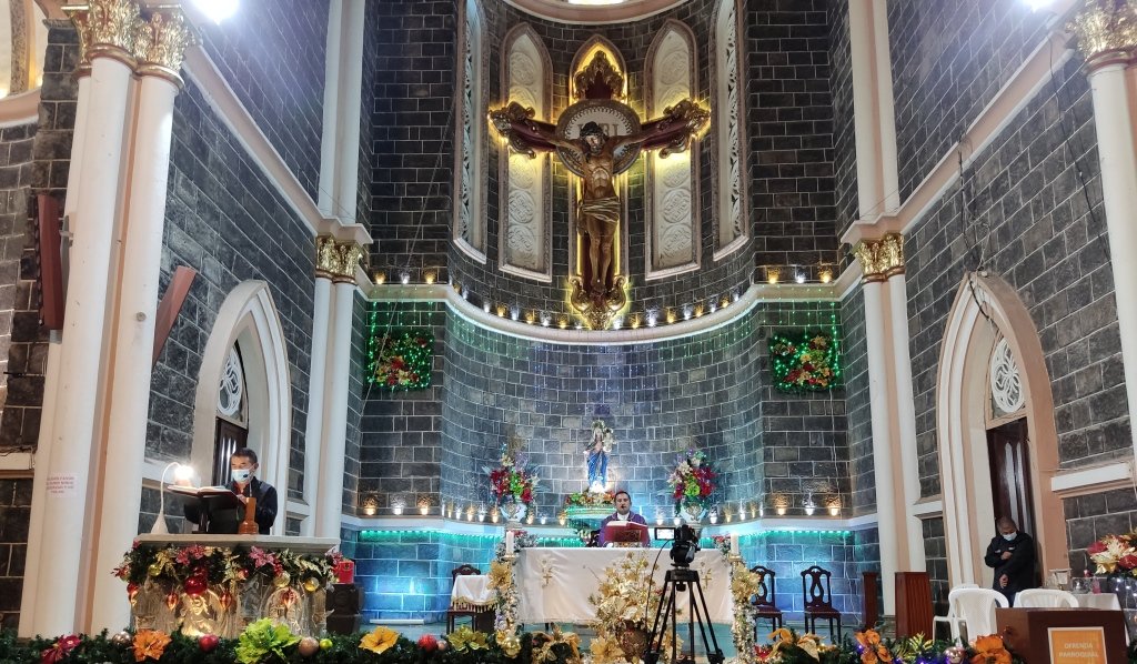En la basílica Nuestra Señora del Rosario de Sandoná el padre Félix Usamag Chamorro celebró la eucaristía y coordinó el rezo en el quinto día de la novena de navidad.