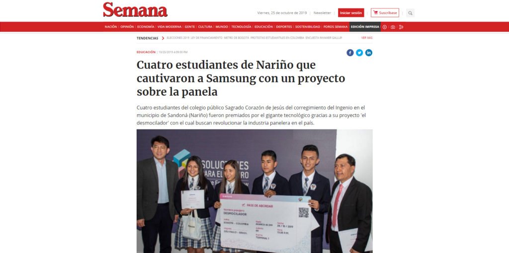 En el artículo titulado “Cuatro estudiantes de Nariño que cautivaron a Samsung con un proyecto sobre la panela”, publicado este viernes en la tarde en la sección Semana Educación, el periodista hace un recuento del proyecto ganador del Concurso Soluciones para el Futuro.