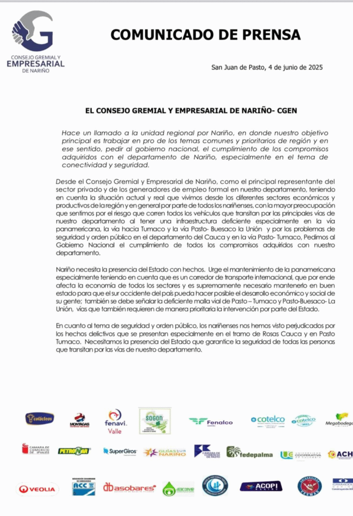 El Consejo Gremial y Empresarial de Nariño (CGEN), principal vocero del sector privado y de los generadores de empleo formal en el departamento, hizo un llamado urgente a la unidad regional para exigir al Gobierno Nacional el cumplimiento de los compromisos adquiridos con Nariño, especialmente en materia de infraestructura vial y seguridad.