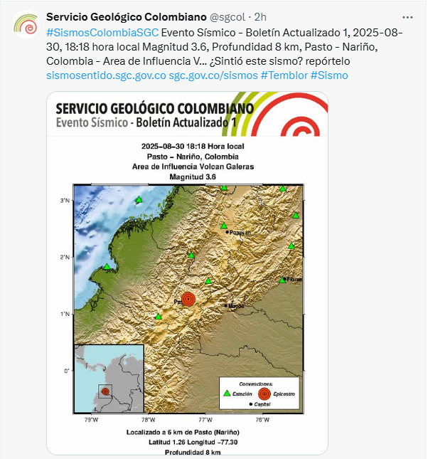 El Servicio Geológico Colombiano (SGC) reportó la ocurrencia de un sismo este sábado 30 de agosto a las 6:18 de la tarde, con una magnitud de 3.6 y una profundidad de 8 kilómetros, localizado en el municipio de Pasto, departamento de Nariño.