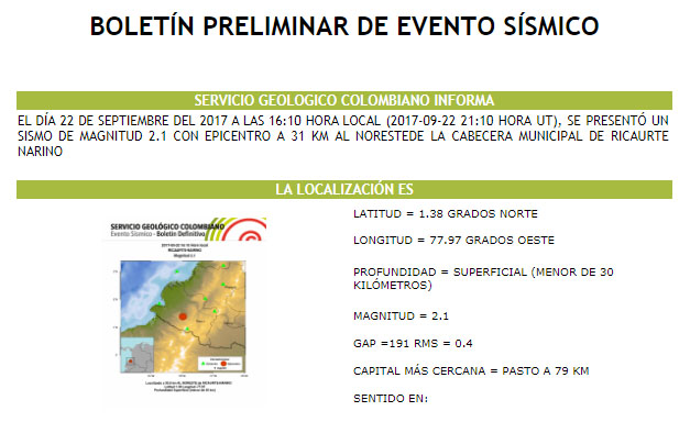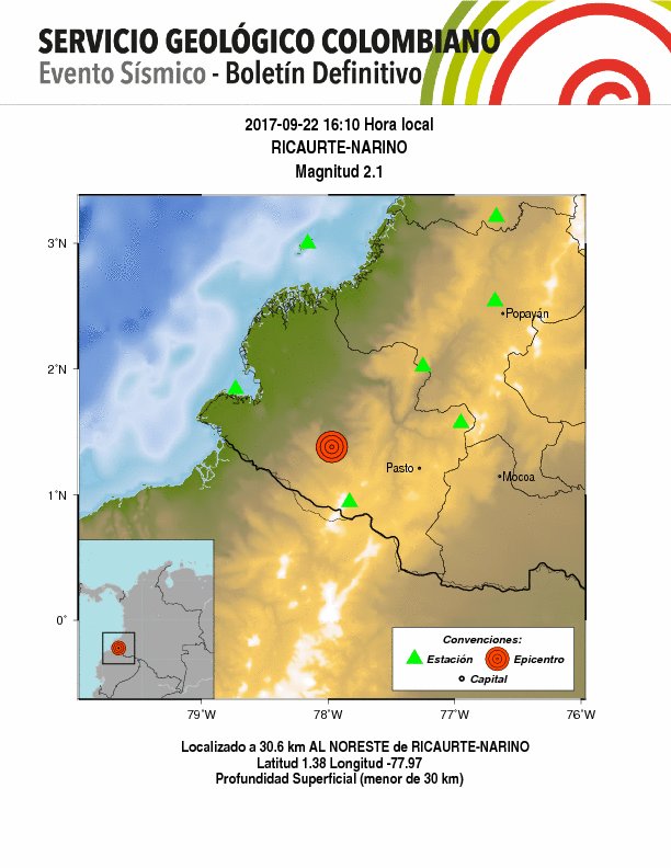 a 30.6 kilómetros al Noreste de Ricaurte Nariño, a una profundidad superficial