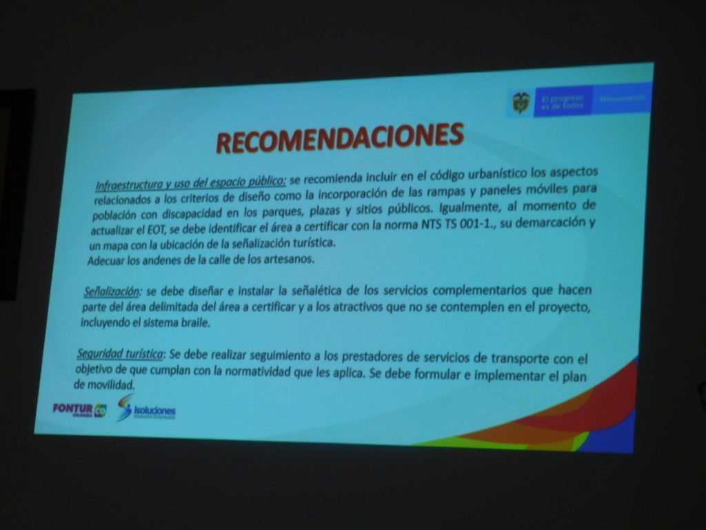 La coordinadora de turismo Isabel Castro manifestó que dentro de las no conformidades o requisitos que se deben cumplir para lograr la certificación, estas dos complejos: la movilidad y la adecuación de accesos en sitios públicos a las personas con discapacidad, para lo cual se los tratará directamente con la alcaldesa María Fernanda Hidalgo Basante.