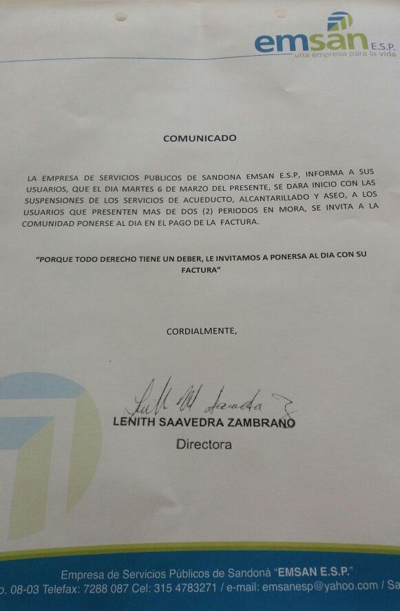 parte de la empresa de servicios públicos Emsan a los usuarios morosos.