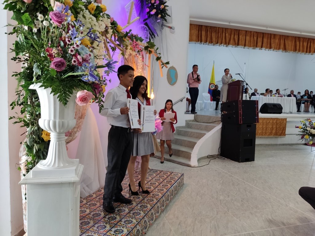 En la primera ceremonia se graduaron de bachilleres académicos 59 estudiantes de los grados 11.1 al 11.3, entre ellos se graduó de manera simbólica el estudiante Yorley Ortega Zamudio. Los docentes Macario Rivera y Deima Betancourt le entregaron el diploma a su padre Fernando.