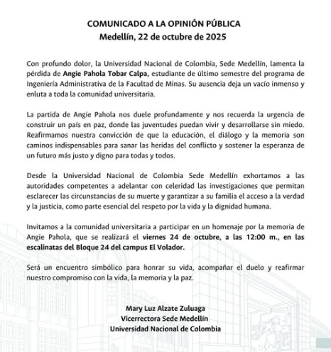 “Extendemos un mensaje de solidaridad y acompañamiento con la familia, así como con las compañeras, compañeros y docentes, reconociendo la gravedad de la situación y reafirmando nuestra disposición para brindar el apoyo que sea necesario”, expresó la vicerrectora de la sede Medellín, Mary Luz Alzate Zuluaga, en aquella oportunidad.
