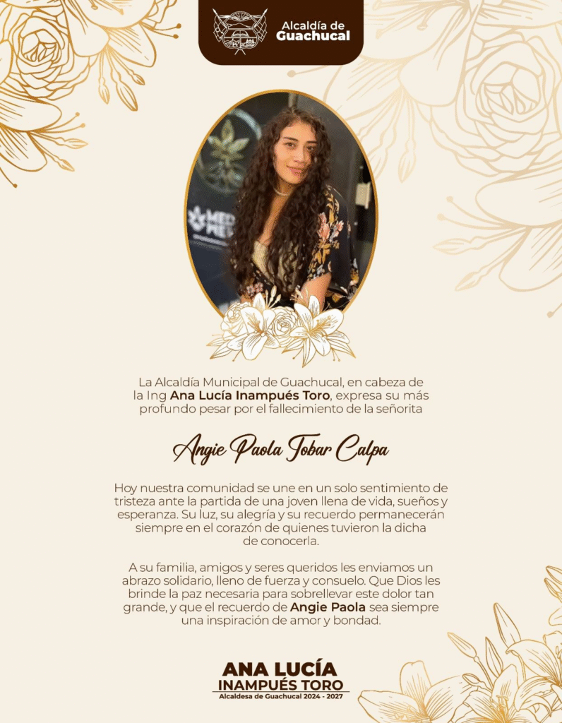 La Alcaldía de Guachucal, liderada por la ingeniera Ana Lucía Inampués Toro, lamentó profundamente la muerte de Angie Pahola Tobar Calpa y expresó su solidaridad con su familia. En el comunicado, destacó que Angie era una joven llena de sueños y esperanza, símbolo de una generación que merece vivir sin miedo. La administración reafirmó su compromiso con la defensa de la vida y la paz, y elevó una oración por su eterno descanso.