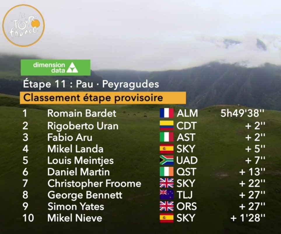 impuso Romain Bardet con 5 horas 49 minutos y 38 segundos, sobre Rigoberto
