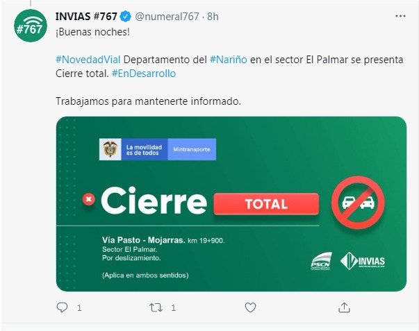 A esta hora varios tuiteros solicitan información a la cuenta @numeral767 del Invias sobre el estado de esta vía que comunica a Nariño con el interior del país.