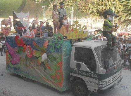 | Carroza de la policía con la reina del carnaval María Fernanda Bucheli y la reina del carnavalito María del Mar Erazo Mora |